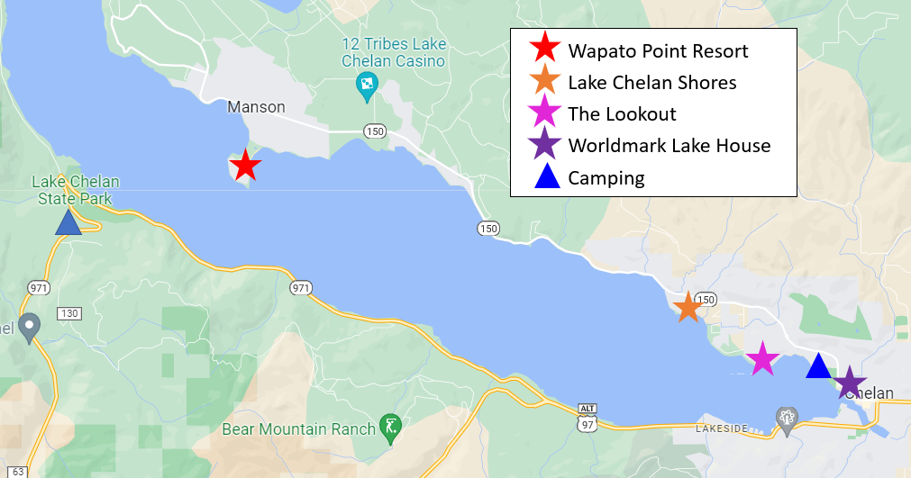 For completeness, here is a list of other popular places/resorts to stay on Lake Chelan. Based on past reunions these didn’t stick out to me as a the best fits for our group but they very well might be perfect for you and your family!